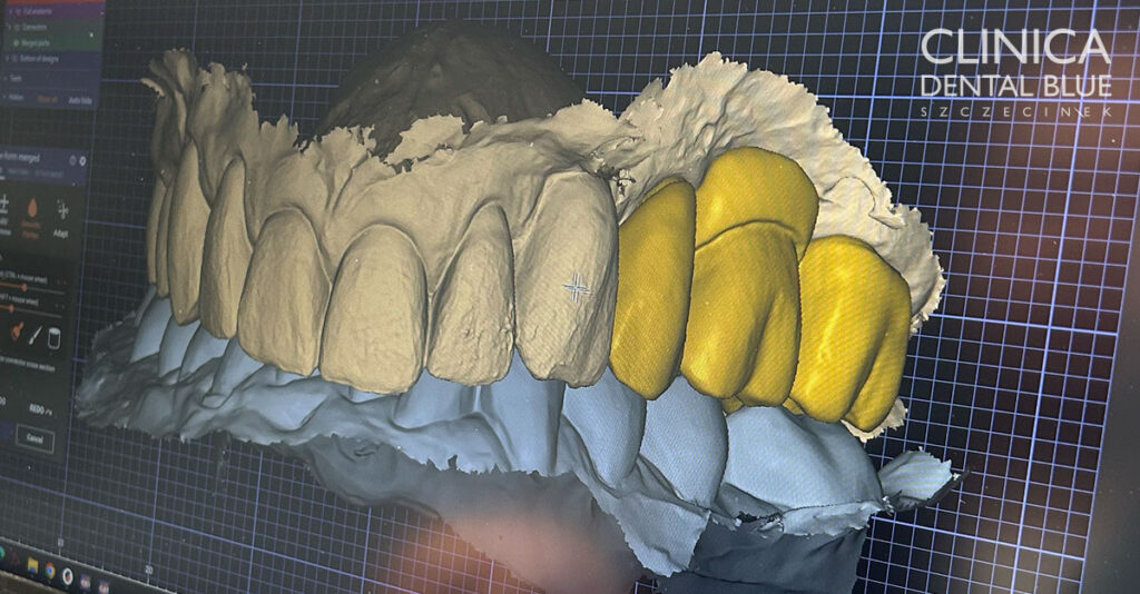 • Skanowanie 3D: Za pomocą skanera wewnątrzustnego tworzony jest cyfrowy obraz zębów i tkanek miękkich.